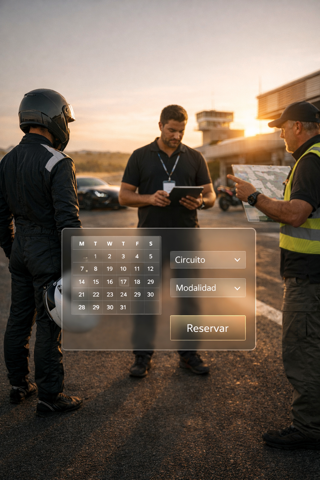 Si sois un grupo de pilotos o un club que quiere rodar en “vuestro” circuito, os lo ponemos fácil. Nos ocupamos de la gestión integral para que vosotros solo penséis en lo importante: disfrutar de la pista. Definimos el formato del día (niveles, tandas, open pitlane, briefing), coordinamos el calendario, la operativa y los proveedores necesarios, y os damos una planificación clara para que cada participante sepa qué hacer y cuándo.